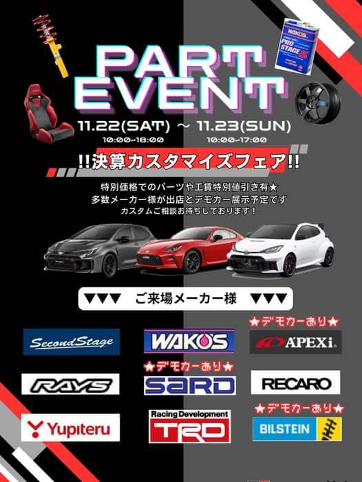 11/22(土)23(日)はGR Garage鈴鹿 PARTS EVENTに出店!