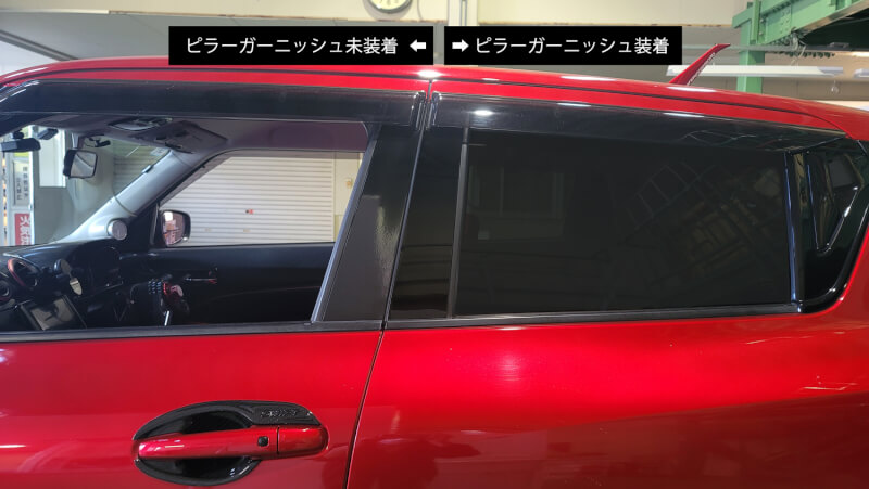 写真左側は純正。右側にはピアノブラックのピラーガーニッシュが装着されています。