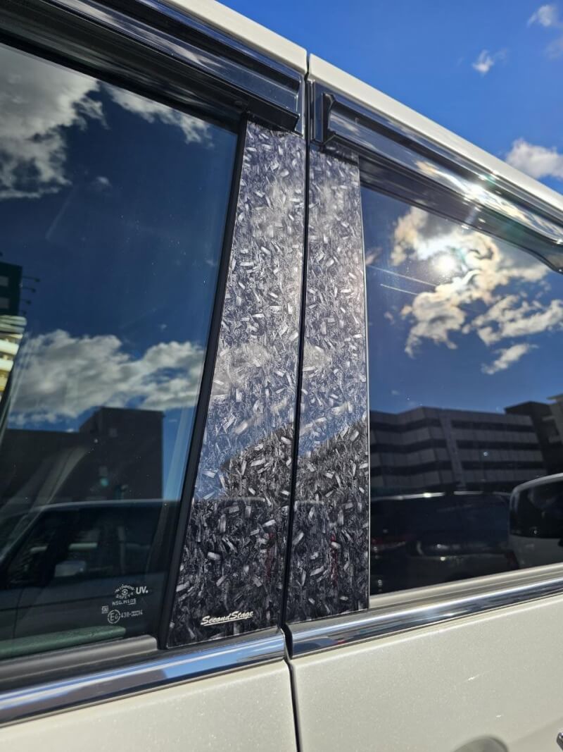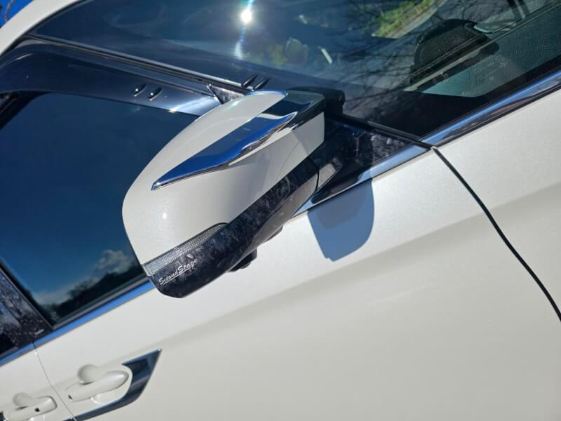 外装品はドアミラーベースパネルもオーダーいただきました。こちらには、ピラーガーニッシュに合わせて、SecondStageのロゴを入れていただきました。